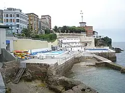 Se acordó iniciar las gestiones para ubicar la sede del club en el edificio de la antigua Aduana (posteriormente dedicado a lonja de pescado), en el puerto local, pero las gestiones resultaron fallidas y se instaló en la calle Corrida, mientras se buscaba ubicación con acceso al mar. El 27 de abril de 1913 se consiguió adquirir los terrenos de la batería de San Pedro, en Cimadevilla, y se construyó el edificio social original en el cerro de Santa Catalina, un pabellón obra de Manuel del Busto, que fue saqueado e incendiado durante la guerra civil española. En 1940 se inició la reconstrucción del nuevo pabellón a partir de un proyecto de los hermanos Somolinos.[3] El 31 de enero de 1920 el presidente del club, José Antonio García Sol, compró a Policarpo Herrero Vázquez en veintiocho mil pesetas pagadas al contado, según consta en la escritura otorgada ante el notario Secundino de la Torre, la finca del balneario "La Cantábrica" para construir una piscina, un frontón y los jardines, según un proyecto del arquitecto Miguel García de la Cruz, concediendo el Ayuntamiento la oportuna licencia, tras los preceptivos informes de sus técnicos.[4][5] En 1925 se creó la piscina, que era de agua de mar y fue la primera en Gijón, a la que siguieron las del Santa Olaya, Universidad Laboral, cuartel de El Coto y, finalmente, la del Real Grupo de Cultura Covadonga en 1962.[6]