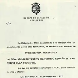 Facsímil del oficio original enviado por Su Majestad Don Juan Carlos I de Borbón, a la directiva del Club España de Honduras.