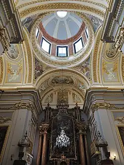 Las bóvedas de la nave y la cúpula se encuentran decoradas con estucos e importantes frescos.