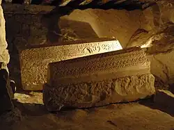 Frente al altar se encuentran dos sarcófagos: uno de ellos tiene en una inscripción una fecha, un nombre y un título que acreditan otro tipo de eventos históricos en torno al santuario: "Martín Fernández, señor principal de los Carabeos y caballero de la Orden de San Juan de Jerusalén, colocado en el sarcófago en el año 1385; a su lado está colocado otro caballero de la misma orden.