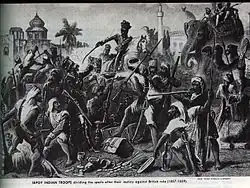 La rebelión de la India de 1857 comenzó como un motín de cipayos, los soldados indios del ejército de la Compañía Británica de las Indias Orientales, el 10 de mayo de 1857 en el acuartelamiento de la localidad de Meerut. Muy pronto, se produjo una escalada del conflicto con el estallido de otros motines y revueltas civiles a lo largo de la llanura del Ganges y del centro de India. Los enfrentamientos principales se produjeron en zonas de los actuales estados indios de Uttar Pradesh, Bihar, el norte de Madhya Pradesh y en la región de Delhi.[2] Esta rebelión supuso una amenaza considerable para el poder de la Compañía Británica en toda la región[3] y no fue sofocada hasta la caída del reino de Gwalior el 20 de junio de 1858.[2] La rebelión de los cipayos también es conocida por algunos historiadores indios como Primera Guerra de Independencia de India.