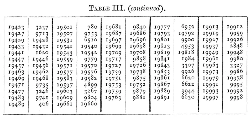 - ↑ Glaisher, J. W. L. (1878). «On circulating decimals with special reference to Henry Goodwin's 'Table of circles' and 'Tabular series of decimal quotients'». Proceedings of the Cambridge Philosophical Society: Mathematical and physical sciences 3 (V): 185-206. Consultado el 27 de marzo de 2022.