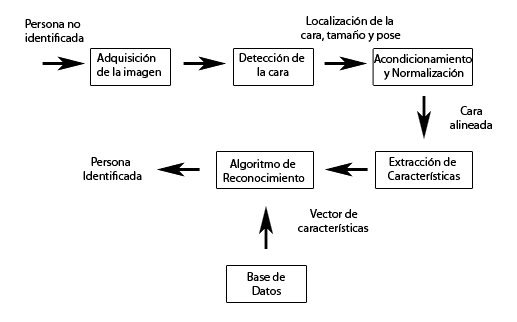 - Reconocimiento: el vector de características extraído se compara con los vectores de características extraídos de las caras de la base de datos. Si encuentra uno con un porcentaje elevado de similitud, nos devuelve la identidad de la cara; si no, nos indica que es una cara desconocida.