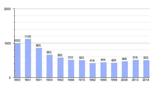 Los datos demográficos contemplados en este gráfico de la comuna de Recoules-Prévinquières[4] se han cogido de 1800 a 1999 de la página francesa EHESS/Cassini, y los demás datos de la página del INSEE.[5]