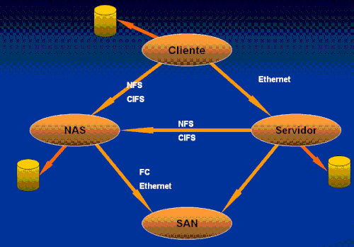 SAN utiliza diferentes protocolos de acceso como Fibre Channel y Gigabit Ethernet. En el lado opuesto se encuentra la tecnología Network-Attached Storage (NAS), donde las aplicaciones hacen las peticiones de datos a los sistemas de ficheros de manera remota mediante protocolos Server Message Block (CIFS) y Network File System (NFS).