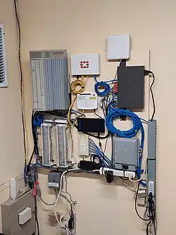 - Red de área local virtual (Virtual LAN, VLAN), es un grupo de ordenadores con un conjunto común de recursos a compartir y de requerimientos, que se comunican como si estuvieran adjuntos a una división lógica de redes de computadoras en la cual todos los nodos pueden alcanzar a los otros por medio de broadcast (dominio de broadcast) en la capa de enlace de datos, a pesar de su diversa localización física. Este tipo surgió como respuesta a la necesidad de poder estructurar las conexiones de equipos de un edificio por medio de software,[13] permitiendo dividir un conmutador en varios virtuales.