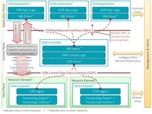 - Controlador SDN (SDN Controller): entidad lógica de control encargada de traducir las peticiones de la aplicación SDN a las rutas de datos más abajo, dando a la capa de aplicación una visión abstracta de la red mediante estadísticas y posibles eventos. Un controlador SDN consiste en uno o más NBIs, la lógica de control SDN y el CDPI driver.