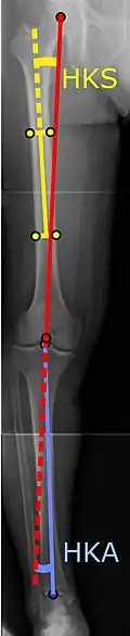 - ↑ Sheehy L, Felson D, Zhang Y, Niu J, Lam YM, Segal N, Lynch J, Cooke TD (Enero de 2011). «Does measurement of the anatomic axis consistently predict hip-knee-ankle angle (HKA) for knee alignment studies in osteoarthritis? Analysis of long limb radiographs from the multicenter osteoarthritis (MOST) study». Osteoarthritis and Cartilage 19 (1): 58-64. PMC 3038654. PMID 20950695. doi:10.1016/j.joca.2010.09.011.