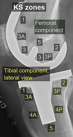 Las zonas estandarizadas alrededor de los componentes se utilizan para especificar, por ejemplo, signos de aflojamiento en el seguimiento radiográfico. Existen varios sistemas de clasificación para especificar tales zonas,[40][41] incluso por zonas SR (Sociedad de la Rodilla) publicadas en 2015.[39]