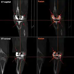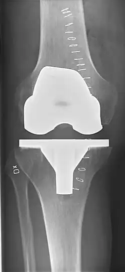 - ↑ Cyteval C (2016). «Imaging of knee implants and related complications». Diagnostic and Interventional Imaging 97 (7-8): 809-21. PMID 27423710. doi:10.1016/j.diii.2016.02.015.