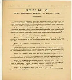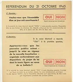 El 21 de octubre de 1945 se celebró en Francia un referéndum constitucional.[1] Se preguntó a los votantes si aprobaban que la Asamblea elegida el mismo día sirviera como Asamblea Constituyente y si, hasta que se aprobara una nueva constitución, el país sería gobernado de acuerdo con un conjunto de leyes propuesto que aparecía en el reverso de la papeleta. Si no se hubiera aprobado la primera propuesta, se habría restaurado la Tercera República, pero su aprobación llevó a la Asamblea electa a redactar una nueva constitución y proponerla al pueblo un año después, dando como resultado la creación de la Cuarta República. Ambas cuestiones fueron aprobadas por amplios márgenes con una participación del 79,8%.[2]