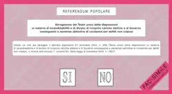- la abolición de la ley Severino: la pregunta propone la abolición del decreto legislativo Severino sobre la confiabilidad, inelegibilidad y caducidad automática de parlamentarios, representantes gubernamentales, consejeros regionales, alcaldes y administradores locales en caso de condena.