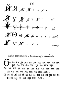De esta manera, no se hizo una clara distinción entre el lenguaje vernáculo y el litúrgico, aunque este último se basó en las normas eslavas del sur más que en las eslavas orientales. A medida que el lenguaje evolucionó, varias letras, notablemente las yuses (Ѫ, Ѭ, Ѧ, Ѩ) fueron descartadas gradual y sistemáticamente tanto del uso secular como de la iglesia durante los siglos siguientes, y ninguno de los varios intentos de estandarización lingüística tuvo éxito.