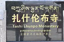 Cartel escrito en Tibetano, Chino mandarín e inglés (para los extranjeros) en un monasterio de Tíbet.