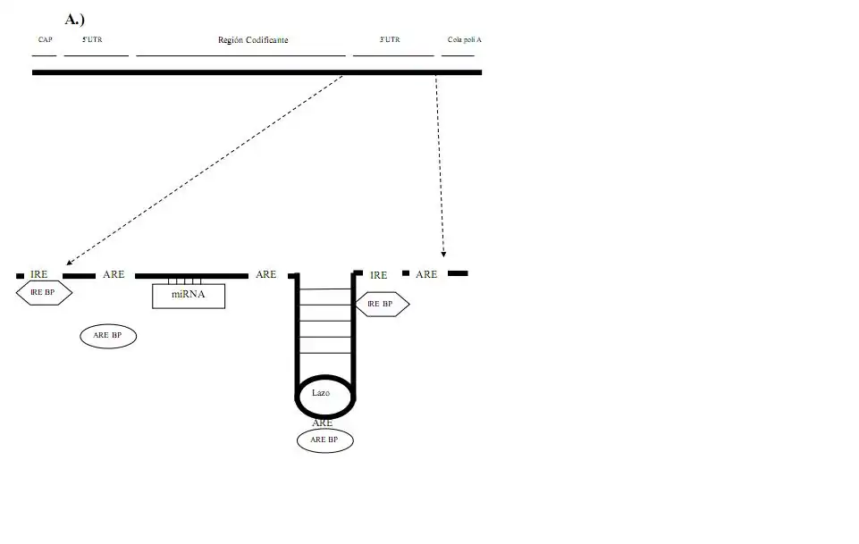 + Secuencias IRE (Iron responsive element), donde se van a unir las IRP (Iron Regulatory Protein) que son proteínas que controlan la expresión de muchos genes (ferritina, transferritina, aconitasa mitocondrial) y se unen en situación de privación de hierro e inhiben la traducción del RNAm.