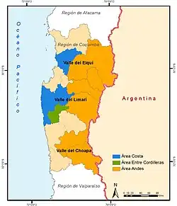 La región vitícola de Coquimbo está situada en la región administrativa de Coquimbo y comprende tres subregiones vitícolas: el Valle del Elqui, el Valle del Limarí y el Valle del Choapa, cuyos límites se extienden a las provincias homónimas de Elqui, Limarí y Choapa, las que a su vez comprenden áreas vinícolas menores.