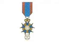 - Cruz del Primer Ejército o de Cataluña. Consta de cuatro brazos triangulares esmaltados en azul turquí. En el centro tiene un escudo circular con corona real en campo rojo y debajo los palos de Cataluña sobre oro. En el exergo se lee «Defensor de mi Rey y del Principado». En el reverso aparece el número «1». La cinta es blanca billeteada de rojo. Todo ello de acuerdo con la Real Orden de 31 de marzo de 1815.[8][9]