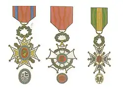 De la parte inferior del escudo penden siete condecoraciones correspondientes a acciones de heroicidad destacada. De izquierda a derecha son las siguientes:[7]