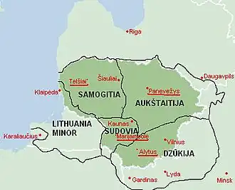 - Samogitia (Žemaitija, lit. 'tierras bajas'): región de Lituania occidental. Su capital es Telšiai, aunque la ciudad más poblada es Šiauliai.