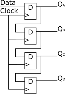 Un registro de desplazamiento es un circuito digital secuencial (es decir, que los valores de sus salidas dependen de sus entradas y de los valores anteriores) consistente en una serie de biestables, generalmente de tipo D, conectados en cascada (Fig. 1), que basculan de forma sincrónica con la misma señal de reloj. Según las conexiones entre los biestables, se tiene un desplazamiento a la izquierda o a la derecha de la información almacenada. Es de señalar que un desplazamiento a la izquierda de un conjunto de bits, multiplica por 2, mientras que uno a la derecha, divide entre 2. Existen registros de desplazamiento bidireccionales, que pueden funcionar en ambos sentidos. Los registros universales, además de bidireccionales permiten la carga en paralelo.