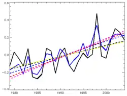 Actualmente (a mayo de 2005) la tendencia en datos basados en los satélites de la versión de Mears et al es de +0,133 °C/década[23]​ y en la versión 5.1 de Spencer y Christy es de +0,085 °C/década[24]​ (el S+C ha experimentado recientemente una revisión no explicada, y la tendencia a mayo de 2005 ahora es de 0,12 °C/década[25]​). Algunos análisis menos actualizados son Fu et al, con 0,2 °C/década (de mayo de 2004)[26]​ y Vinnikov y Grody, con +0,22 °C a 0,26 °C por década (de octubre de 2003).[27][28]​ Esto puede compararse con el aumento del registro superficial de aproximadamente 0,06 °C/década durante el último siglo y 0,15 °C/década desde 1979.