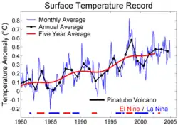 La temperatura global está sujeta a fluctuaciones de corto plazo que se superponen a las tendencias de largo plazo y pueden enmascararlas temporalmente. La relativa estabilidad de la temperatura superficial en 2002-2009, periodo bautizado como el hiato en el calentamiento global por los medios de comunicación y algunos científicos,[36]​ es coherente con tal incidente.[37][38]​ Actualizaciones realizadas en 2015 para considerar diferentes métodos de medición de las temperaturas oceánicas superficiales muestran una tendencia positiva durante la última década.[39][40]