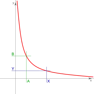 donde e es un producto constante. Para que esta constante se conserve, un aumento de A necesitará una disminución de B, para que su producto permanezca constante. Esta relación puede representarse de la forma: