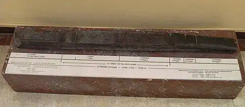 La vara de medición más antigua conservada es una barra de aleación de cobre que data de hacia el 2650 a. C., encontrada por el asiriólogo alemán Eckhard Unger mientras excavaba en Nippur. También se sabe que se usaron reglas hechas de marfil durante el período de la cultura del valle del Indo, mucho antes del 1500 a. C. Durante las excavaciones de Lothal (2400 a. C.) se encontró una de esas reglas calibradas, con marcas situadas aproximadamente a 1/16 de pulgada (1,6 mm).[20] Ian Whitelaw sostiene que la regla de Mohenjo-Daro se divide en unidades correspondientes a 1,32 pulgadas (33,5 mm), marcadas con subdivisiones decimales con una precisión asombrosa, con un error máximo de 0,005 pulgadas (0,1 mm). Los ladrillos antiguos que se encuentran en toda la región tienen dimensiones que corresponden a estas unidades.[21]