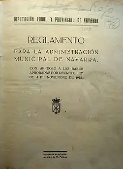 - ↑ Diputación Foral y Provincial de Navarra, 1928, Reglamento para la administración municipal de Navarra, con arreglo a las bases aprobadas por Decreto Ley el 4 de noviembre de 1926, Pamplona: Imprenta provincial.