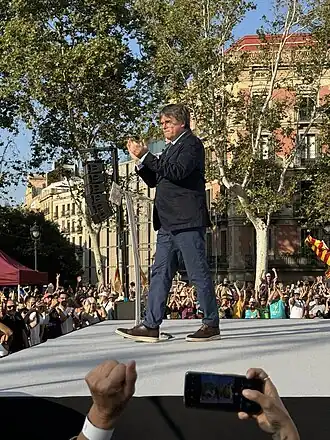A la mañana, acompañado del Presidente del Parlamento de Cataluña, Josep Rull, entre otros, Puigdemont recorrió el Passatge de Sant Benet y la calle Trafalgar, antes de llegar hasta el escenario instalado en el Arco del Triunfo, de espaldas a la Avenida Vilanova. Allí, Junts tenía preparado un "recibimiento institucional" en el que se congregaron unas 3000 personas, entre las que se encontraban ciudadanos de a pie, diferentes partidos y plataformas independentistas.[7] Durante el vídeo difundido por redes sociales en donde la comitiva llegaba al escenario, se vio un hombre sin camiseta saliendo de un establecimiento.[8]