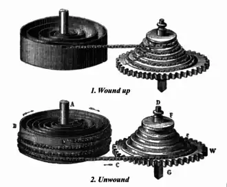Para garantizar el funcionamiento a velocidad constante de los relojes de cuerda, se idearon una serie de dispositivos mecánicos encaminados a obtener en todo el recorrido del resorte espiral un par de giro constante. Hasta que se dispuso de aceros de calidad con capacidad de almacenar energía suficiente utilizando únicamente la parte del arrollamiento del muelle que se comporta de forma lineal, se utilizaron dispositivos como el stackfreed[9][10][11] (que permitía regular la fuerza motriz del resorte aplicando una fuerza de rozamiento variable) y el caracol[12] (que se valía del radio variable de un engranaje de forma cónica, que aumentaba el par resultante compensando la pérdida de tensión de los antiguos resortes espirales a medida que se iban desenrollando).