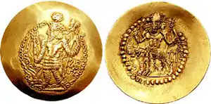 El anverso de la moneda suele representar al gobernante con un elaborado tocado y, en el reverso, un altar de fuego zoroástrico o a Shiva con el toro Nandi.