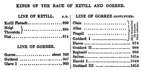 | Olaf Sigtryggsson* | 1030?–1034[27] | Rey de Mann y de otras islas | Hijo de Sigtrygg Silkbeard y nieto de Olaf Cuaran |