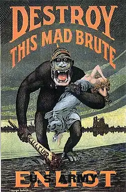 En el cartel antes mencionado, los Estados Unidos de América se representan como una máquina de guerra monstruosa y viciosa que busca destruir la cultura europea. El cartel alude a muchos aspectos negativos de la historia estadounidense, como el Ku Klux Klan, la opresión de nativos americanos, y linchamiento de los negros. El cartel condena a los estadounidenses capitalismo, el dominio percibido de Estados Unidos por el judaísmo y muestra bombas estadounidenses que destruyen una aldea europea indefensa. Sin embargo, Estados Unidos lanzó varias campañas de propaganda a cambio de que la Alemania nazi retratara a menudo a la Alemania nazi como un país belicista con una moral inferior y esquemas de lavado de cerebro.
