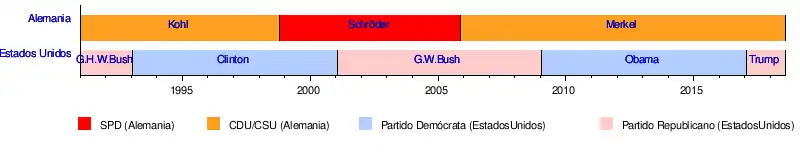 El esfuerzo de Alemania para incorporar cualquier acción militar importante en el progreso lento Política Europea de Seguridad y Defensa no cumplió con las expectativas de los Estados Unidos durante la guerra del Golfo. Después de los ataques del 11 de septiembre, las relaciones políticas germano-estadounidenses se fortalecieron en un esfuerzo por combatir el terrorismo, y Alemania envió tropas a Afganistán como parte de la fuerza de la OTAN. Sin embargo, la discordia continuó durante la guerra de Irak, cuando el canciller alemán Gerhard Schröder y el ministro de relaciones exteriores Joschka Fischer hicieron esfuerzos para prevenir la guerra y, por consiguiente, no se unieron a los Estados Unidos y el Reino Unido con la fuerte multinacional en Irak.[48][49] El antiamericanismo salió a la superficie después de los ataques del 11 de septiembre de 2001 cuando los intelectuales alemanes hostiles argumentaron que había vínculos feos entre la globalización, la americanización y el terrorismo.[50]