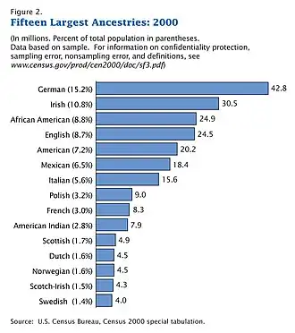 Durante más de tres siglos, la inmigración de Alemania representó una gran parte de todos los inmigrantes estadounidenses. A partir del Censo de los EE. UU. Del 2000, más del 20% de todos los estadounidenses y el 25% de los estadounidenses blancos, afirman ser de ascendencia alemana. Los germanoamericanos son un grupo asimilado que influye en la vida política en los Estados Unidos en general. Son el grupo étnico autoinformado más común en la mitad norte de los Estados Unidos, especialmente en el Estados Unidos, Medio Oeste. En la mayor parte de Sur, los estadounidenses de origen alemán son menos comunes, con la excepción de Florida y Texas.