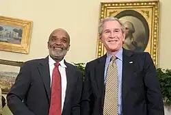 Después de la caída de la familia Duvalier y otros regímenes militares, Jean-Bertrand Aristide fue elegido en 1990, pero fue derrocado en un golpe de Estado 7 meses después. De 1991 a 1994, la Administración Clinton impuso un bloqueo económico, que empobreció aún más al país, y finalmente la Administración Clinton intervino militarmente en 1994 para restaurar el poder de Aristide.[6]: 4 [2] El apoyo de los Estados Unidos a Aristide disminuyó debido a preocupaciones de corrupción, y una rebelión armada en febrero de 2004 lo llevó a su exilio.[6]: 4