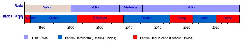 Las relaciones Estados Unidos-Rusia se refieren a la relación bilateral entre los Estados Unidos de América y la Federación de Rusia. Estados Unidos y Rusia mantienen relaciones diplomáticas y comerciales. La relación fue generalmente cálida bajo el presidente ruso Boris Yeltsin (1991-1999) hasta el bombardeo de la OTAN a la República Federal de Yugoslavia en la primavera de 1999, y desde entonces se ha deteriorado significativamente.[1] En 2014, las relaciones se deterioraron mucho más debido a la crisis en Ucrania, la anexión de Crimea por parte de Rusia en 2014,[2] las diferencias con respecto a la intervención militar rusa en la guerra civil siria y desde finales de 2016 por las acusaciones de interferencia rusa en las elecciones presidenciales de Estados Unidos de 2016.[3] Las sanciones mutuas impuestas en 2014 siguen vigentes.