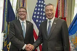 Singapur tiene relaciones militares desde hace mucho tiempo con los Estados Unidos. Estados Unidos vende armas a Singapur y proporciona acceso a sus bases para entrenar a los servicios armados de Singapur fuera de su pequeña ciudad-estado.[15] En virtud del Acuerdo Marco Estratégico de los EE. UU. y Singapur, algunos buques de combate litoral de la Armada de los EE. UU. están desplegados de forma rotativa en la Base Naval de Changi de Singapur.[16] El Air Force One también aterriza en Paya Lebar Air Base cuando el presidente visita el país.