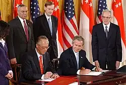 Los Estados Unidos y Singapur firmaron un acuerdo bilateral de libre comercio el 6 de mayo de 2003; el acuerdo entró en vigor el 1 de enero de 2004. El crecimiento de la inversión de los Estados Unidos en Singapur y la gran cantidad de estadounidenses que viven allí aumentan las oportunidades de contacto entre Singapur y los Estados Unidos. Singapur es un país Programa de exención de visa.[3]