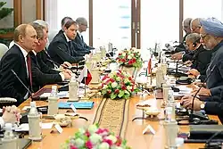 La primera iniciativa política importante, desde el colapso de la Unión Soviética, entre India y Rusia comenzó con la Asociación Estratégica firmada entre los dos países en 2000. El presidente Vladímir Putin declaró en un artículo escrito por él en el Hindú , Declaración sobre la estrategia: La asociación entre India y Rusia firmada en octubre de 2000 se convirtió en un paso verdaderamente histórico.[21][22] El ex primer ministro Manmohan Singh también estuvo de acuerdo con su contraparte en un discurso pronunciado durante la visita de 2012 del presidente Putin a India: El presidente Putin es un amigo valioso de la India y el arquitecto original de la asociación estratégica India-Rusia.[23] Ambos países colaboran estrechamente en asuntos de interés nacional compartido que incluyen en las Naciones Unidas, BRICS, G20 y SCO, donde India tiene el estatus de observador y Rusia ha pedido que se convierta en miembro de pleno derecho.[9] Rusia también apoya firmemente que India reciba un asiento permanente en el Consejo de Seguridad de las Naciones Unidas.[10] Además, Rusia ha respaldado vocalmente a la India uniéndose al NSG[24] y APEC.[25] Además, también ha expresado interés en unirse a la SAARC con estatus de observador en el que India es miembro fundador.[12][11] Actualmente Rusia es uno de los dos únicos países del mundo, el otro es Japón, que tiene un mecanismo para las revisiones anuales de defensa a nivel ministerial con India.[1] La Comisión Intergubernamental Indo-Rusa (IRIGC) es uno de los mecanismos gubernamentales más grandes y completos que India ha tenido con cualquier país a nivel internacional. Casi todos los departamentos del gobierno de la India lo asisten.[1]