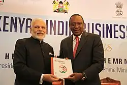 Como Estados ribereños del océano Índico, los vínculos comerciales entre India y Kenia se remontan a varios siglos atrás. En Kenia vive una gran minoría de indios y personas de origen indio, descendientes de los trabajadores que trajeron los británicos para construir el ferrocarril de Uganda y de comerciantes gujarati.[144] India y Kenia mantienen crecientes lazos comerciales. El comercio bilateral ascendió a 2.400 millones de dólares en 2010-2011, pero las importaciones keniatas procedentes de la India representaron 2.300 millones, por lo que la balanza comercial se inclinó claramente a favor de la India. India es el sexto socio comercial de Kenia y el mayor exportador a este país. Las exportaciones indias a Kenia incluyen productos farmacéuticos, acero, maquinaria y automóviles, mientras que las exportaciones keniatas a India son productos primarios como ceniza de sosa, verduras y té. Las empresas indias tienen una presencia significativa en Kenia, donde operan corporaciones como Tata Group, Essar Group, Reliance Industries y Bharti Airtel.