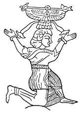 | Dibujo de grifo en un cinturón urartiano, Karmir-Blur, Museo de Historia de Armenia | Divinidades aladas, talla de hueso, Toprak-kale, Museo de Civilizaciones de Anatolia. | Divinidad alada, parte de la decoración del trono de Urartu, bronce, Toprak-kale, Hermitage. |