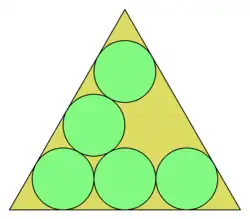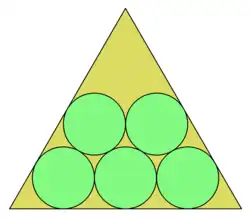 - ↑ Payan, Charles (1997), «Empilement de cercles égaux dans un triangle équilatéral. À propos d'une conjecture d'Erdős-Oler», Discrete Mathematics (en francés), 165/166: 555-565, MR 1439300, doi:10.1016/S0012-365X(96)00201-4..