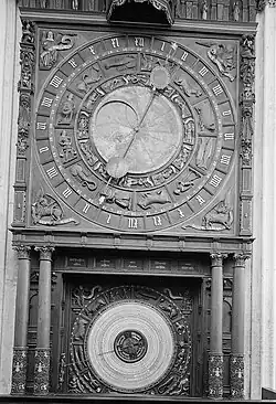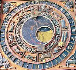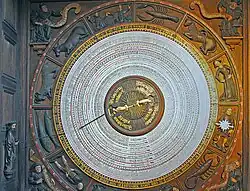 El cuadrante del reloj mide poco más de 16 m² y data de 1472,[6] siendo junto con el marco del calendario y el mecanismo la única parte original. Los elementos más destacados son las figuras talladas, la manecilla y los anillos; todo ello proporciona una base para indicar el tiempo así como detalles astronómicos y astrológicos. La hora aparece señalada de una forma bastante peculiar que puede resultar compleja: compuesto el cuadrante por cinco anillos, el exterior cuenta con dos secciones numeradas del uno al doce a derecha e izquierda, disponiendo a su vez de una única manecilla la cual indica la hora. Esta manecilla da un giro completo cada 24 horas y posee dos indicadores: una mano en un extremo y una estrella en el otro, si bien ambos marcan la misma hora aunque cada uno en una sección distinta (la mano figura en la sección superior durante el día y en la inferior durante la noche). En lo relativo a la astronomía y la astrología, hay dos anillos con figuras en relieve y un anillo con números, destacando a mayores dos discos superpuestos los cuales tienen acoplada una varilla cada uno y giran alrededor del centro del cuadrante, con el disco externo numerado en el margen del 1 al 29 para indicar el ciclo lunar. De los dos anillos con figuras, el más grande muestra los signos del Zodíaco, mientras que el anillo inmediato exterior los divide de cinco en cinco grados hasta el número 30. El signo Géminis se halla ubicado arriba a la derecha seguido en el sentido de las agujas del reloj por Tauro, Aries, Piscis, Acuario, Capricornio, Sagitario, Escorpio, Libra, Virgo, Leo y Cáncer. Dentro del anillo de los signos zodiacales se ubica otro anillo con figuras representativas de los meses, empezando con enero abajo a la derecha y siguiendo hasta diciembre en el sentido contrario a las agujas del reloj: enero aparece representado por un caballero elegante cenando; febrero por un hombre calentándose frente al fuego; marzo por un hombre plantando dos árboles; abril por una mujer cavando; mayo por un granjero sembrando; junio por un segador cortando la hierba con una guadaña; julio por una granjera cortando maíz con una hoz; agosto por un granjero desgranando maíz con un mayal; septiembre por un viticultor cosechando vides; octubre por un hombre recogiendo manzanas, noviembre por un hombre cortando leña; y diciembre por un hombre matando un cerdo.[6]