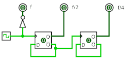 El divisor de frecuencia es un circuito digital formado por una sucesión de contadores enlazados para obtener una frecuencia de 1 Hz, que permite mostrar segundos. Si se quieren mostrar décimas, la división se detiene al llegar a los 10 Hz.