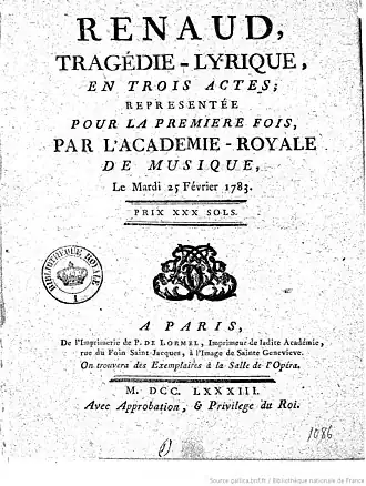 - Esta obra contiene una traducción parcial derivada de «Renaud (opera)» de Wikipedia en inglés, publicada por sus editores bajo la Licencia de documentación libre de GNU y la Licencia Creative Commons Atribución-CompartirIgual 4.0 Internacional.