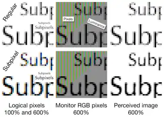 Con la tecnología de renderización de subpixel, aumenta el número de puntos que pueden abordarse de forma independiente para reconstruir la imagen. Cuando los subpíxeles verdes están reconstruyendo la paleta, los subpíxeles rojos se están reconstruyendo cerca de los picos y viceversa. En el caso de las fuentes de texto, el aumento de la capacidad de direccionamiento permite al diseñador de fuentes utilizar frecuencias y fases espaciales que habrían creado distorsiones notables si se hubieran procesado los píxeles completos. La mejora es más notoria en las fuentes en cursiva que muestran diferentes fases en cada fila. Esta reducción en la distorsión de muaré es el beneficio principal de las fuentes renderizadas de subpixel en el panel RGB a rayas convencional.