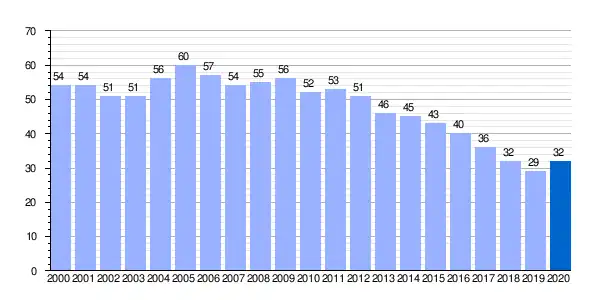 | Gráfica de evolución demográfica de Renedo de Valdavia entre 2000 y 2020 |