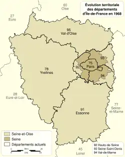 El departamento de Sena y Oise, rodeaba por completo el departamento del Sena, fue disuelto constituyendo la totalidad de los departamentos de Essonne, Val-d'Oise e Yvelines y transfiriendo comunas a los departamentos de Altos del Sena (9 comunas[3]), de Sena-Saint Denis (16 comunas[4]) y de Valle del Marne (18 comunas[5]).